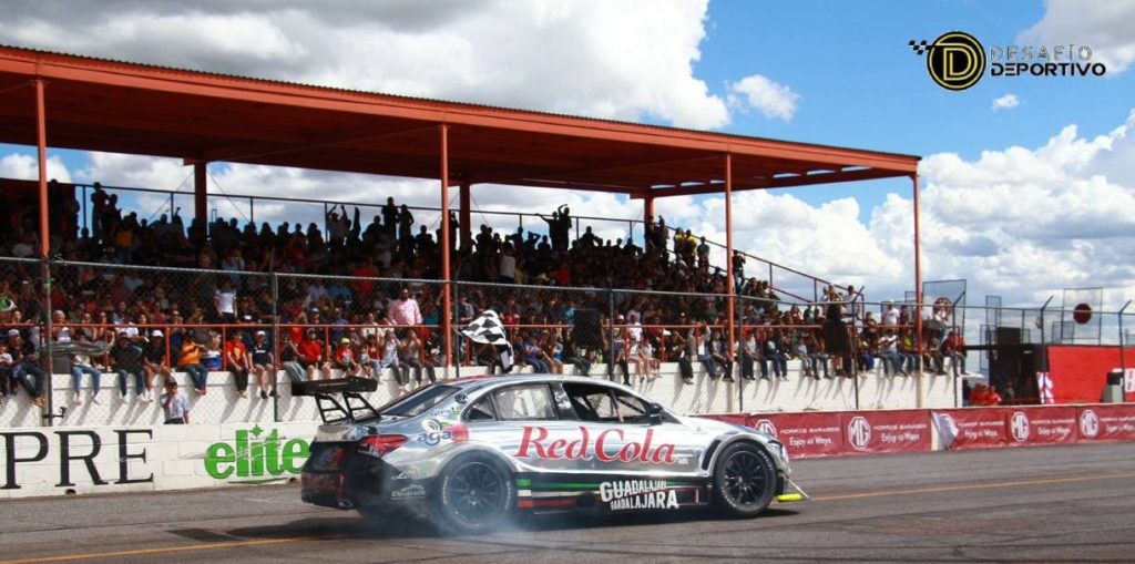 Auto AGA-RedCola-Agua SKARCH del “Copetín” de Alba con bandera a cuadros de victoria, homenajeado por aficionados de tribuna llena.