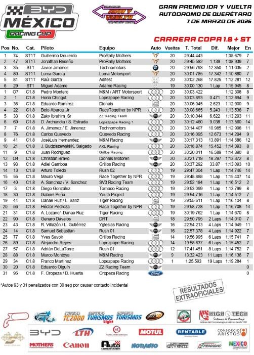 Los Copa 1.8 en la primera carrera, Pedro Montero logro estupenda victoria, seguido por el internacional Horia Chirigut y Eduardo Ramírez. Para la segunda carrera, Pedro Montero repite primer lugar, acompañado en el podio por A. y E. Jiménez y Zaky I. Sr. y Christian Bravo en cuarto lugar, haciendo extraordinario trabajo en esta segunda competencia.