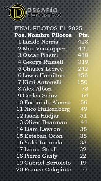Verstappen, Piastri y Norris, un cierre de temporada esperado. Max Verstappen situándose como el máximo ganador del 2025 con su séptima victoria en Yas Marina, atrás Oscar Piastri en el segundo lugar, piloto que era nuestro gallo para la corona, pero el peso del patrocinio (papá de Norris) en McLaren tuvo mayor poder para que la balanza se inclinara hacia Lando Norris, quien finalizó en el tercer puesto de esta gran final y quien se adjudicó por vez primera a sus 26 años las guirnaldas de olivo del Mundial F1 2025 con lágrimas en los ojos.