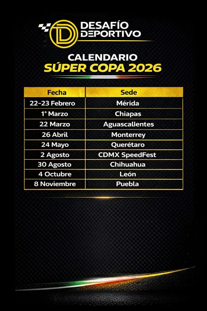 El campeonato SÚPER COPA iniciará su temporada 2026 con dos fechas en fines de semana continuos, comenzando en las ciudades de Mérida y Tuxtla Gutiérrez, innovador calendario de la organización en esta nueva aventura en territorio mexicano que contempla en total NUEVE fechas.